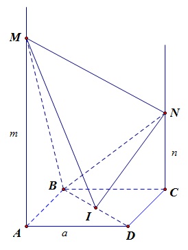 Cho hình vuông $ABCD$ cạnh $a$, tâm $I$ ($A$ đối diện với $C$). Các nửa đường thẳng $Ax, Cy$ vuông góc với mặt phẳng $(ABCD)$ và ở cùng một phía đối với mặt phẳng đó. Cho điểm $M$ không trùng với $A$ trên $Ax$, cho điểm $N$ không trùng với $C$ trên $Cy$. Đặt $AM = m, CN = n$.