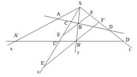 Cho hai đường thẳng $\Delta ,\Delta '$. Các tia $Sx,Sy,Sz,St$ lần lượt cắt $\Delta $ tại $A,B,C,D$ cắt $\Delta '$ tại $A',B',C',D'$. Chứng minh rằng : $\left( {ABCD} \right) = - 1$ khi và chỉ khi $\left( {A'B'C'D'} \right) = - 1$