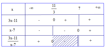 Bất phương trình \((2) \Leftrightarrow \frac{3x-11}{x-7}\geq 0\)