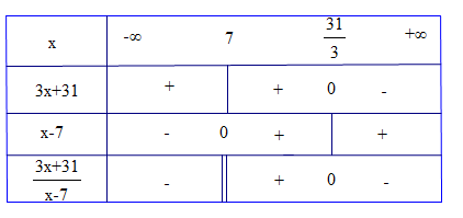 Bất phương trình \((3) \Leftrightarrow \frac{-3x+31}{x-7}\leq 0\)