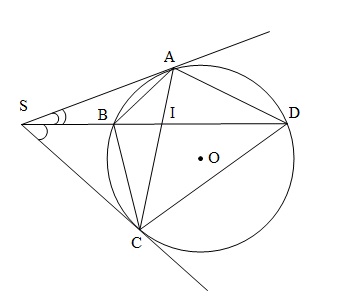 Cho tứ giác $ABCD$ nội tiếp đường tròn $(O)$. Các tiếp tuyến với $(O)$ tại $A, C$ và $BD$ đồng quy tại $S$. Chứng minh rằng : $\frac{{\sin \widehat {ASB}}}{{\sin \widehat {CSB}}} = {\left( {\frac{{AB}}{{CB}}} \right)^2} = {\left( {\frac{{AD}}{{CD}}} \right)^2}$