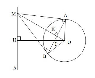 Cho đường tròn $\left( O \right)$ và đường thẳng $\Delta $ không cắt $\left( O \right)$, $M$ là một điểm chạy trên $\Delta $. Qua $M$ kẻ các tiếp tuyến $MA, MB$ tới $\left( O \right)$. Chứng minh rằng $AB$ luôn đi qua một điểm cố định.