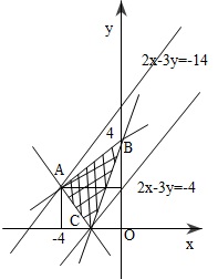 Dễ thấy $D$ chính là tam giác $ABC$ với $A(-4;2); C(-2;0)$. Xét họ đường thẳng $2x-3y=\alpha$. Ta thấy ngay giá trị bé nhất của $\alpha$ để nó còn cắt $\triangle ABC$ là khi nó đi qua $A$, tức là khi $\alpha=-14$; còn giá trị lớn nhất khi nó qua $C$, tức là $\alpha =-4$.