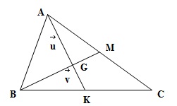 Cho $AK$ và $BM$ là hai trung tuyến của $\Delta ABC$. Hãy phân tích các vec-tơ $\overrightarrow{AB}, \overrightarrow{BC},\overrightarrow{CA} $ theo hai vec-tơ $\overrightarrow{u}=\overrightarrow{AK}; \overrightarrow{v}=\overrightarrow{BM}. $